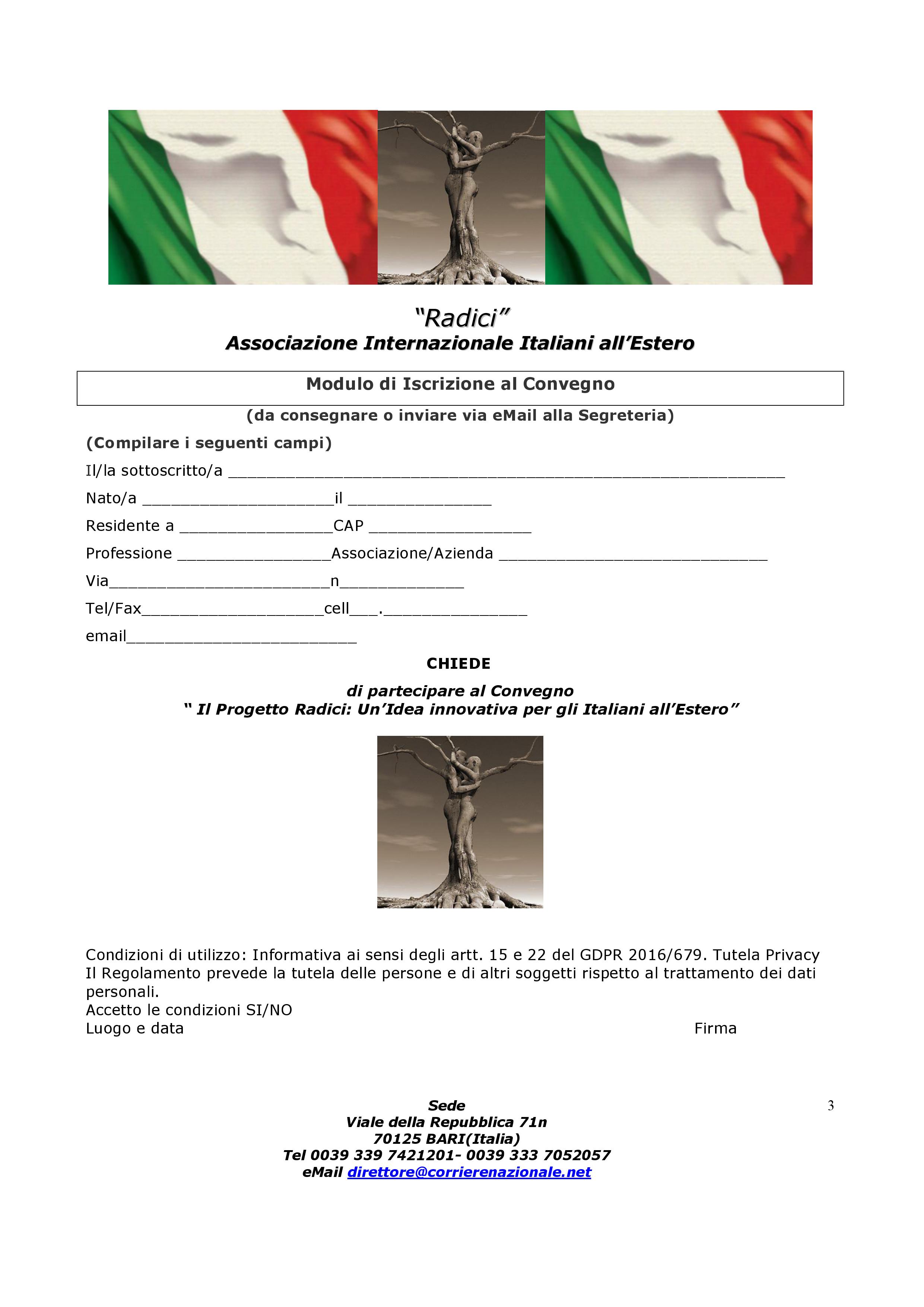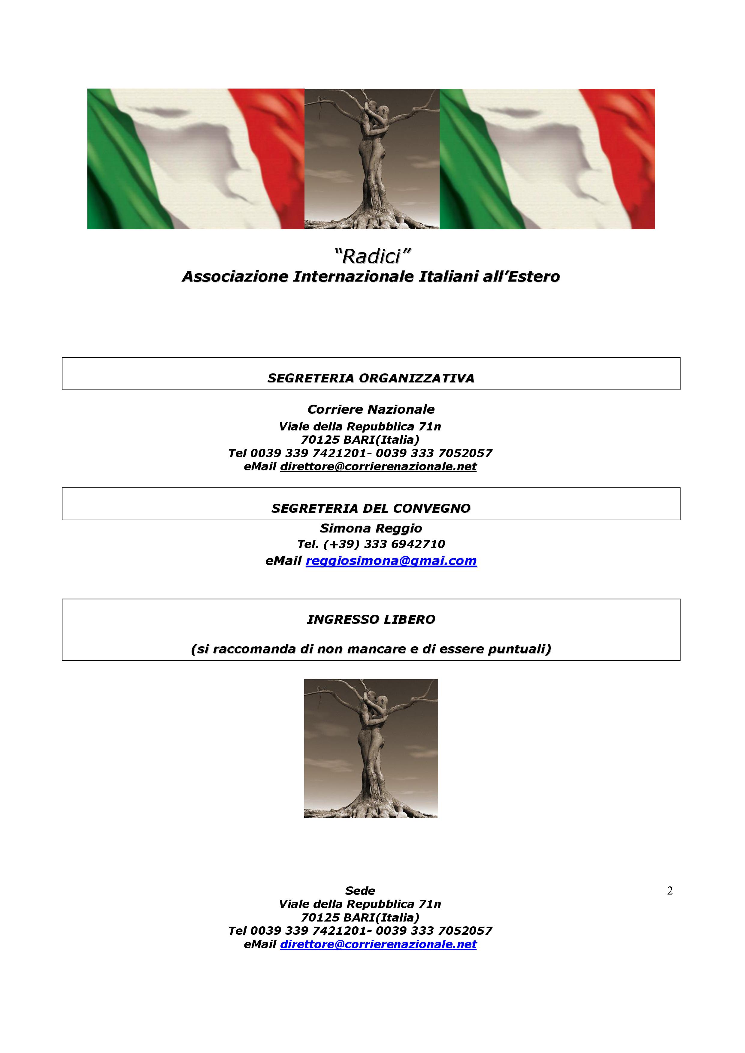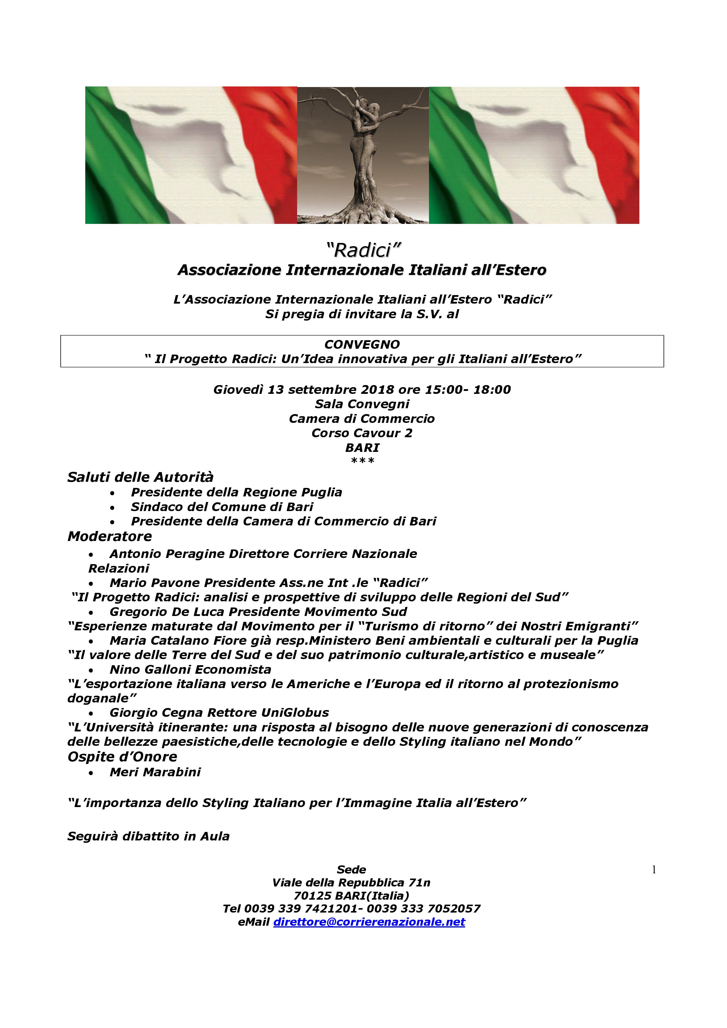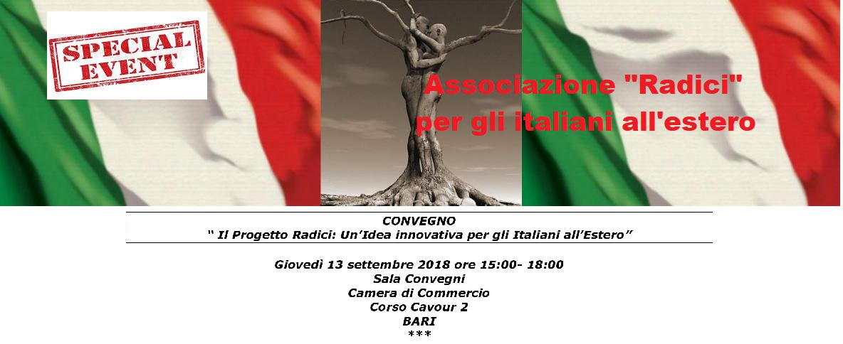 Presentazione del Progetto Radici alla Camera di Commercio di Bari il prossimo 13 settembre. Il “Progetto Radici”, è diretto a promuovere l’immagine delle Regioni del Sud Italia presso i nostri connazionali emigrati in vari Paesi del Mondo ed a favorire il cosiddetto “turismo di ritorno” nei paesi d’origine attraverso la conoscenza del territorio, dei prodotti dell’agroalimentare, dell’ospitalità rurale e delle tradizioni culturali e religiose.