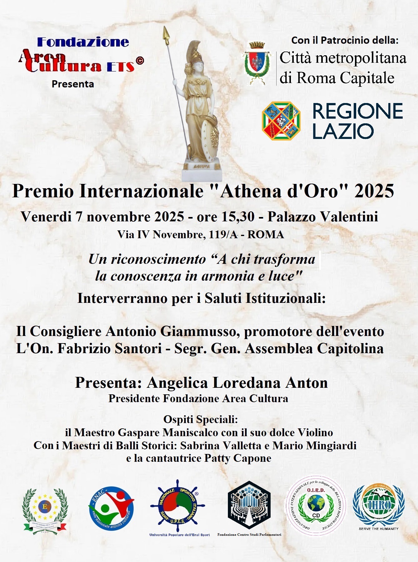 Roma si prepara ad accogliere uno degli appuntamenti più attesi dell’anno nel panorama culturale italiano: il Premio Internazionale “Athena d’Oro”, che si terrà venerdì 7 novembre 2025 a Palazzo Valentini, prestigiosa sede istituzionale nel cuore della Capitale.